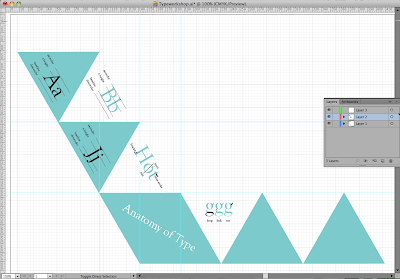 I wanted my booklet to be fold out and wanted it to stand out so I decided that a folding triangular format would work well. It took me a while to make the initial equilateral triangle in illustrator (it should have a triangle tool). I then started to fill in the content from previous type workshops that I remembered, also referring to this website: http://www.typographydeconstructed.com/